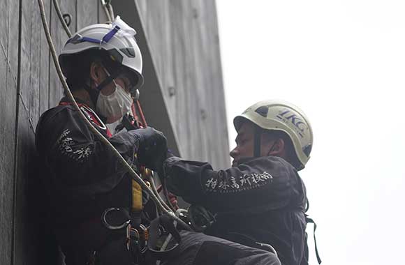 特殊高所技術では、ロープの登高と下降に使う常用基本装備に加え、必要最小限のレスキュー機材を通常装備として連携するよう指導しています。